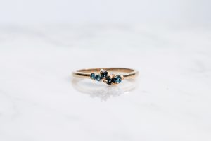 Anillo con 5 topacios azules redondos 1 de 2.30mm, 2 de 2mm, 1 de 1.80mm y 1 de 1.50mm, brazo de 1.5mm